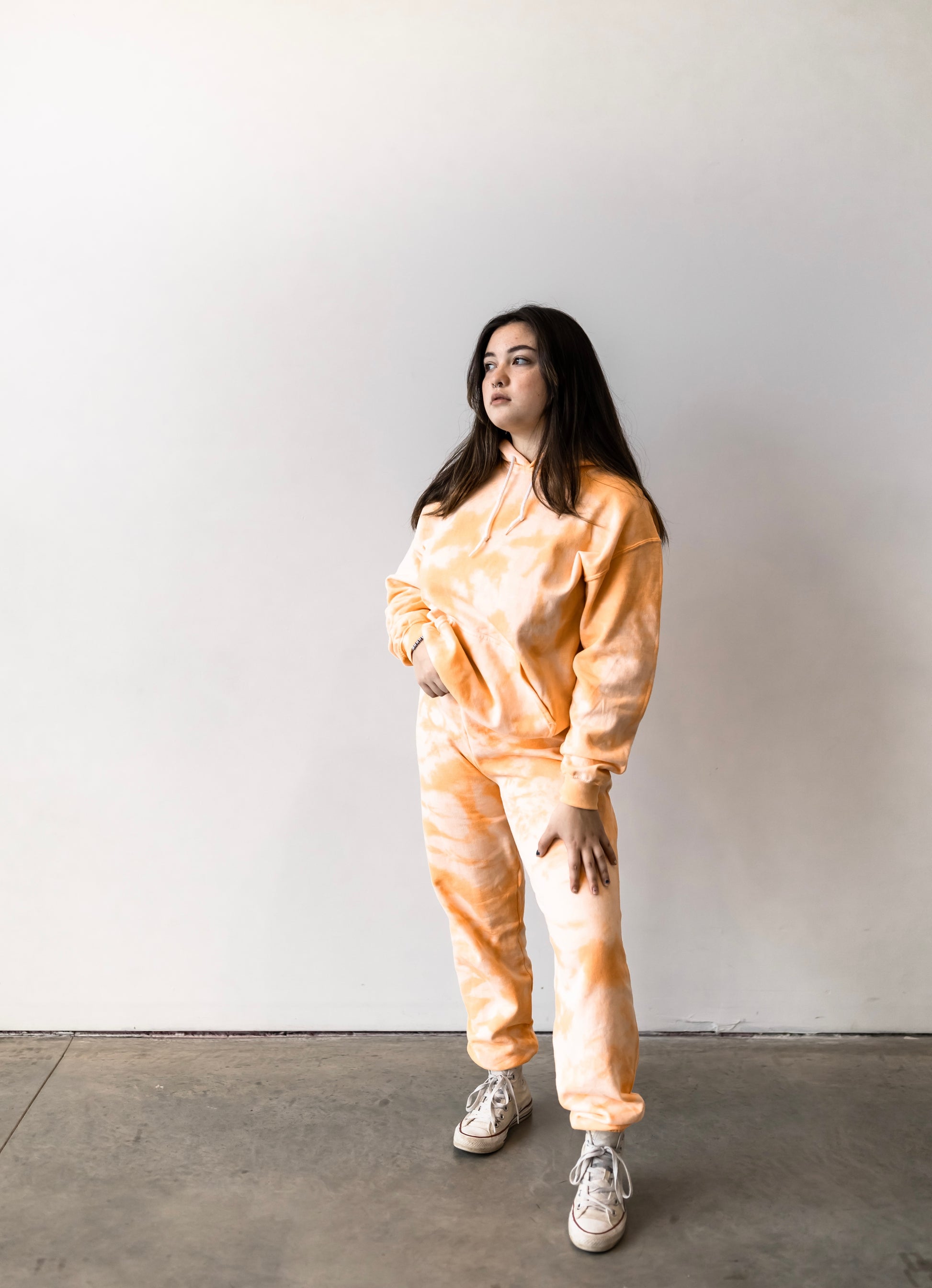 The loungewear sets you've been looking for are here. Sometimes, things are just better together. Our two piece creamsicle orange tie dye sweatsuits come with a creamy orange tie dye pullover hoodie and the matching tie dye sweats! Your choice of cropped hoodie or full length, of course. Get matching or different colors to be cute and comfy with your bestie