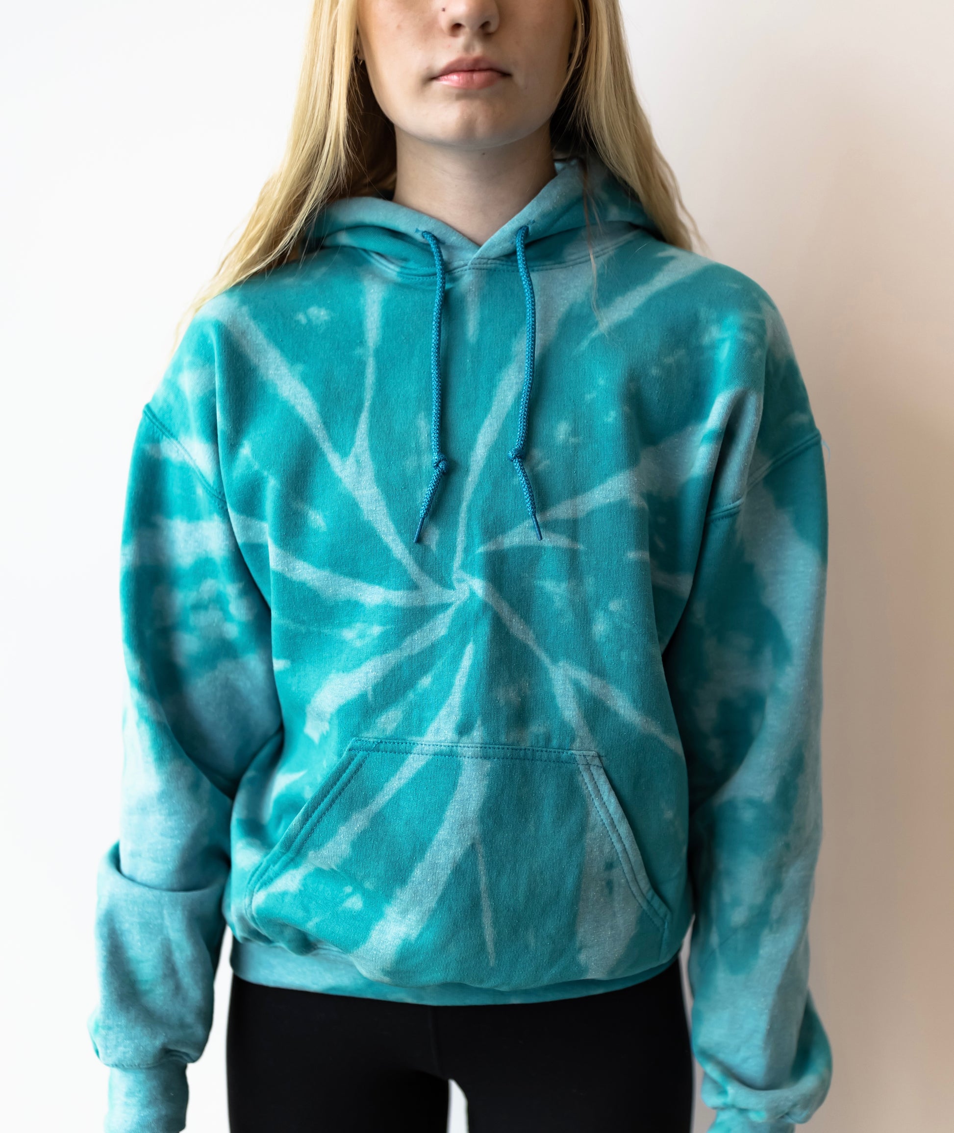 We cannot contain our excitement when it comes to this hoodie. The bleach coming together with the solid blue to make this beautiful icy blue combination. You're going to need this item in your closet.