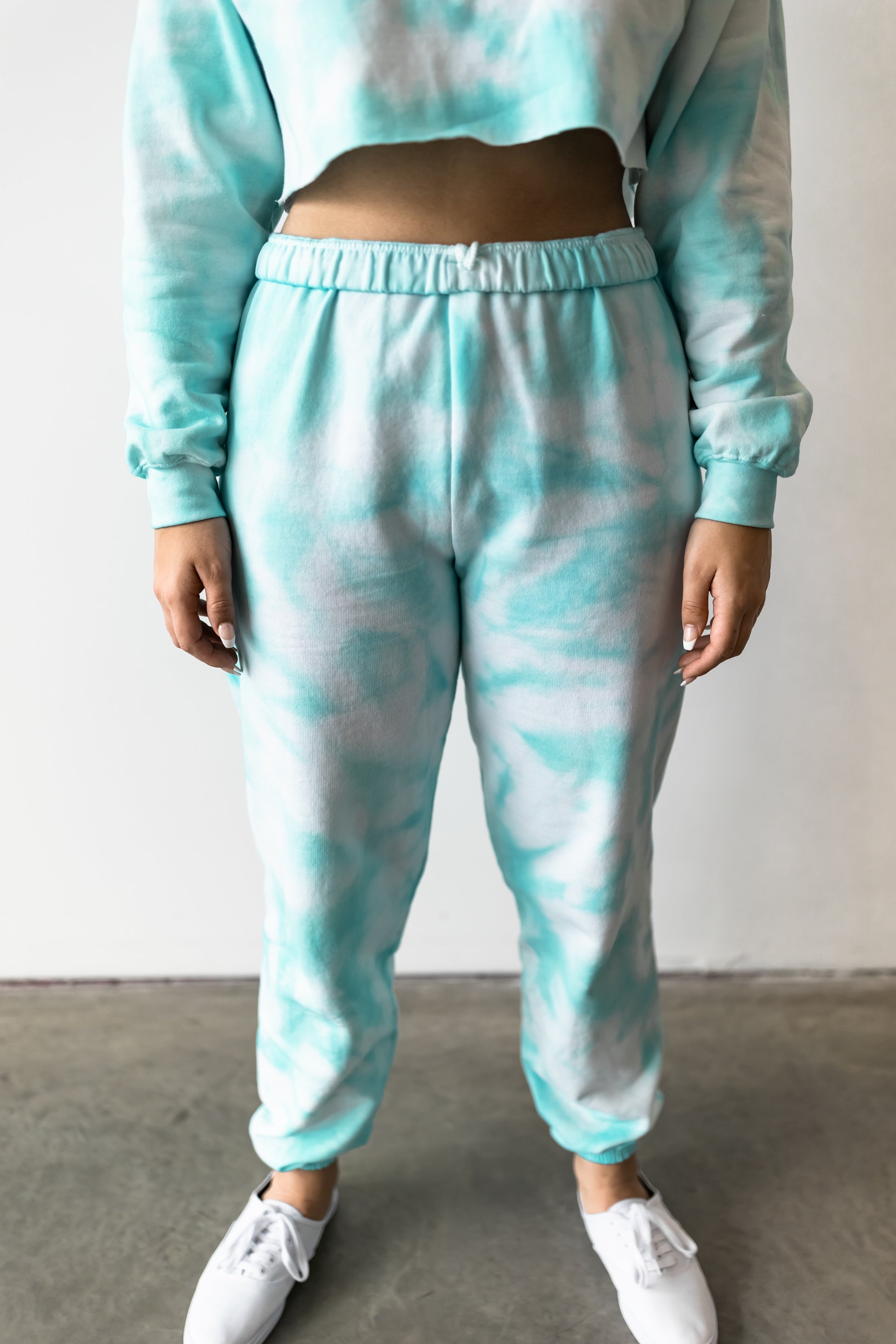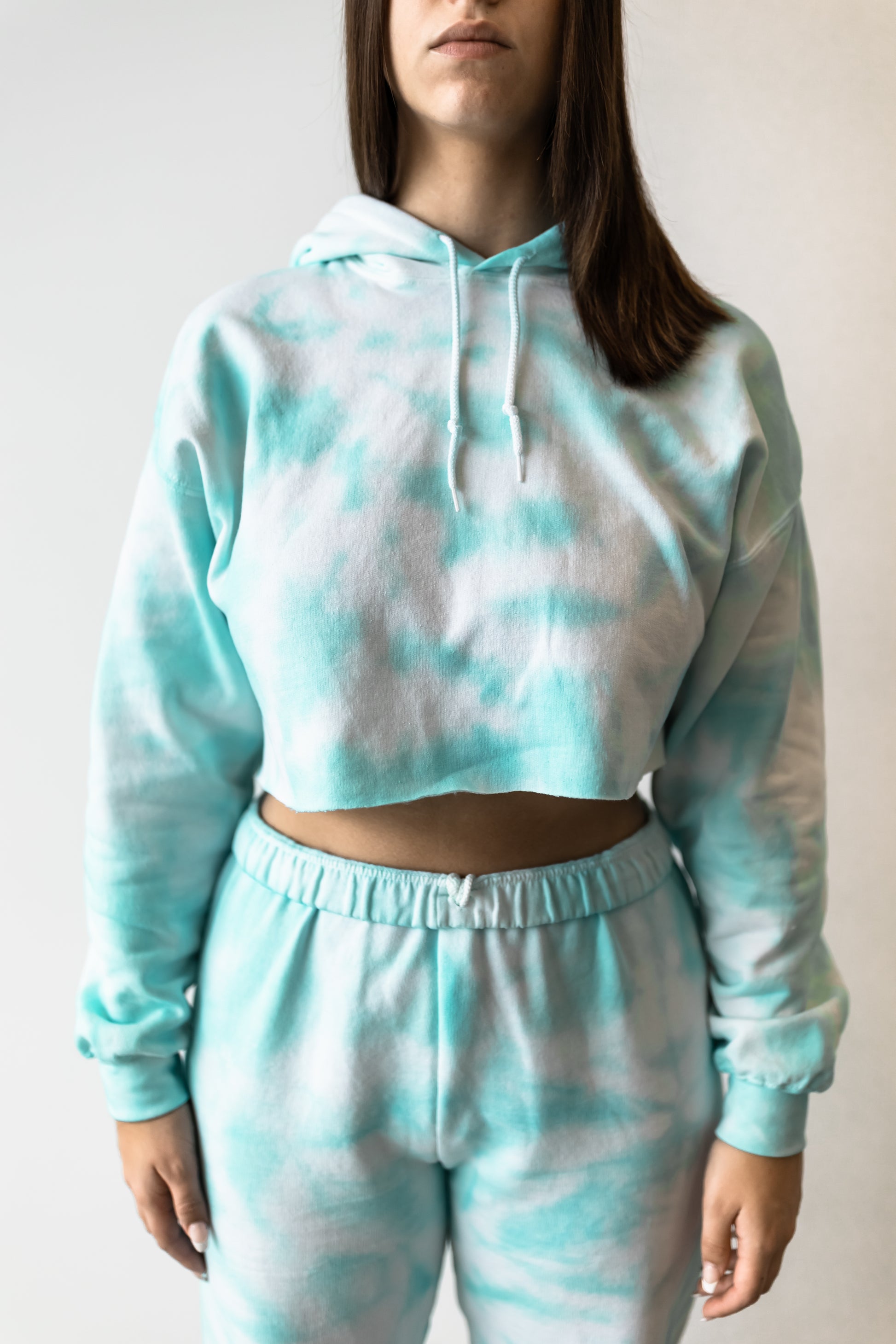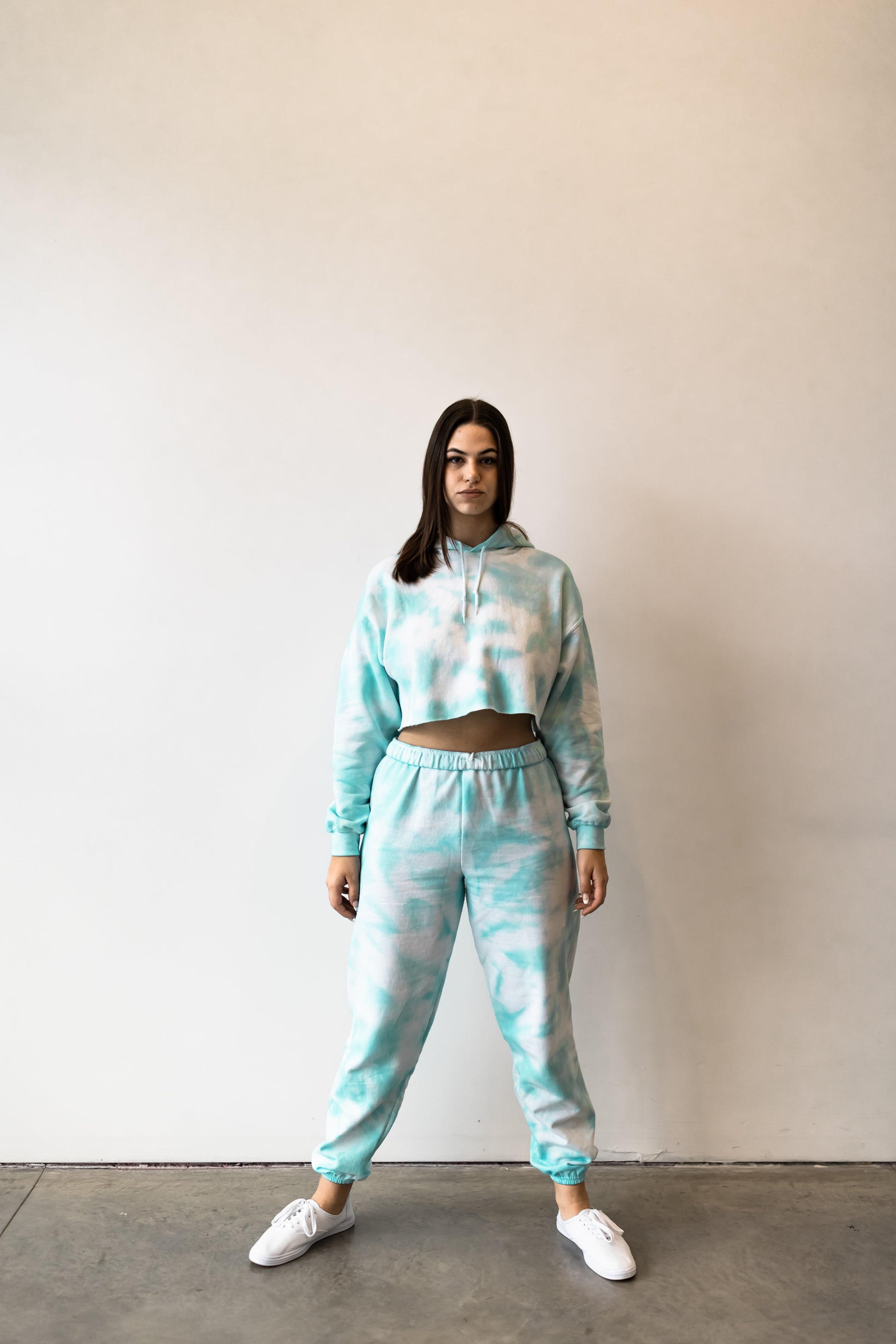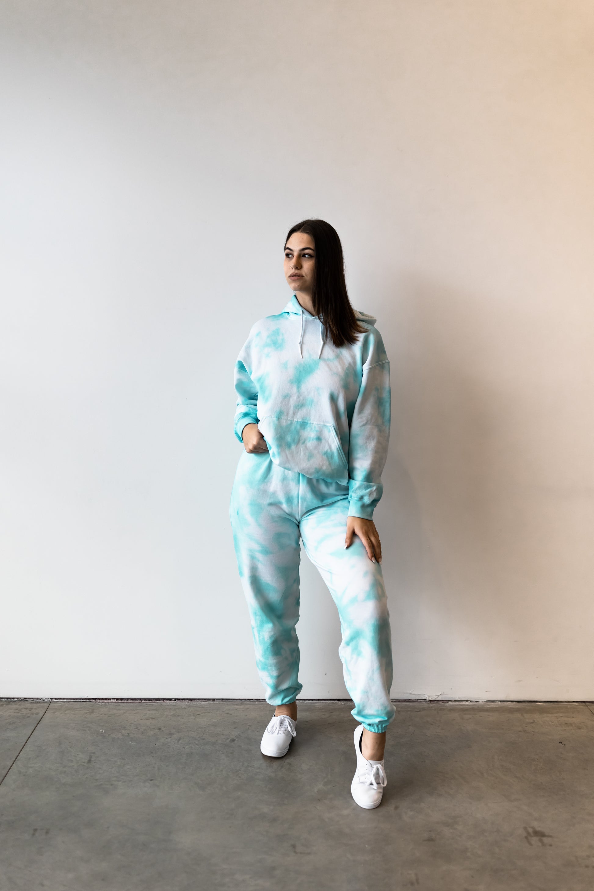 The loungewear sets you've been looking for are here. Sometimes, things are just better together. Our two piece "Icy" blue tie dye sweatsuits come with a light blue tie dye pullover hoodie and the matching light blue tie dye sweats! Your choice of cropped hoodie or full length, of course. Get matching or different colors to be cute and comfy with your bestie